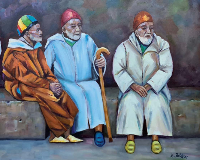 En exposant des toiles représentant des femmes mineures mariées avec enfant, des jeunes filles bergères déscolarisées, les femmes et les corps des femmes dans l’espace public, la recherche d’interactions sociales à l’âge de la retraite et de spiritualité pour réduire l’isolement, les femmes tisseuses qui préservent un savoir-faire ancestral et prennent leur avenir en main en devenant entrepreneuses, la transmission des valeurs et coutumes marocaines…