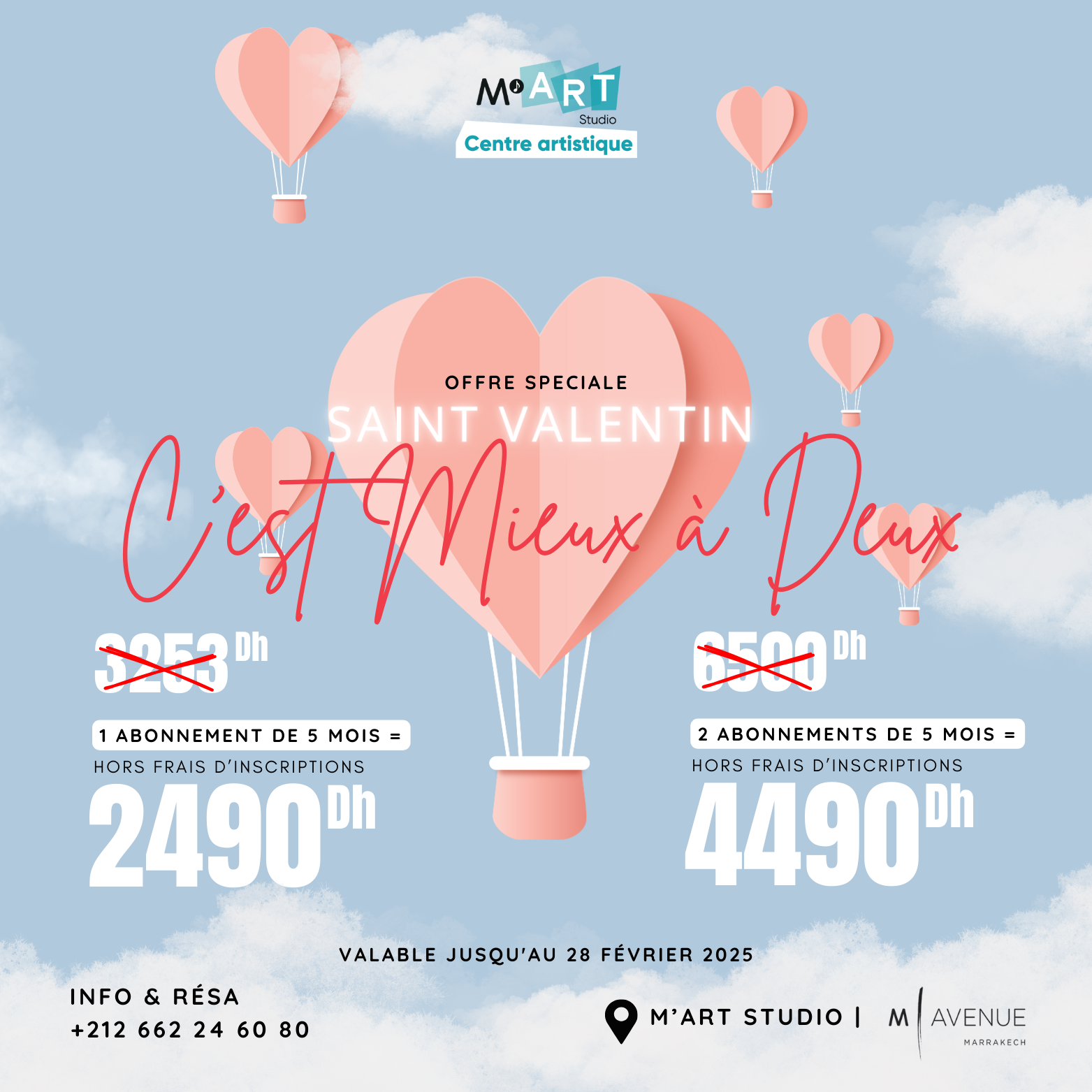 Du 3 au 28 février 2025, M'Art Studio invite les couples, amis ou membres d'une même famille à profiter d'un abonnement artistique de 5 mois pour seulement 2490 Dhs. Et pour ceux qui souhaitent doubler le plaisir, deux abonnements sont proposés au tarif avantageux de 4490 Dhs. Ces formules permettent aux participants d'explorer ensemble des univers créatifs tout en renforçant leurs liens. Chaque atelier devient ainsi une véritable célébration de l'amour, de l'amitié ou des liens familiaux.