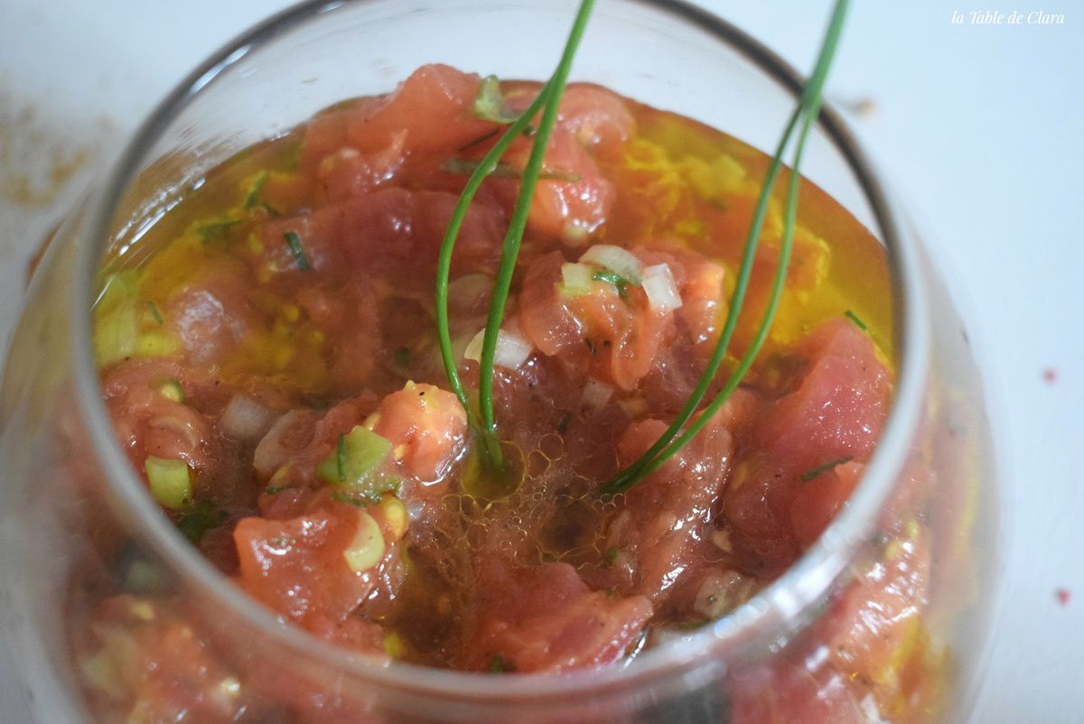 1-Commencez par préparer les tomates. Coupez les tomates en quarts, retirez les graines puis hachez la chair en petits dés.
