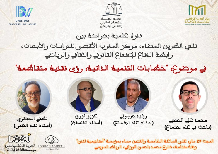 Dans ce cadre, Dyae Way, Club spécialisé dans les questions du DP, en partenariat avec le Centre d'Etudes et de Recherches Al-Maghrib Al-Aqsa, l'Alliance de Défense pour le Rayonnement Juridique, Culturel et Sportif organisent , un séminaire scientifique, auquel sont conviés un groupe de professeurs et chercheurs en philosophie, psychologie et sociologie, sur le thème : «Critiques Croisés sur les Discours du Développement Personnel » le samedi 27 mai à 17H30 au siège de London Academy (http://londonacademy.ma) sise à l’adresse : rue Ketama, Avenue Mohammed Belhassen El-Wazzani, Rabat-Suisi.