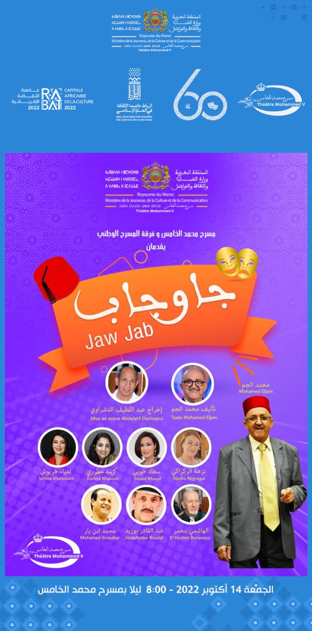 Décidément cette soirée était un rendez-vous avec le rire, l’humour raffiné qu’il ne fallait rater sous aucun prétexte, c’était l’occasion propice des retrouvailles avec les maîtres de la comédie marocaine, sous la houlette du grand humoriste Mohamed Al Jam, qui nous ont présenté une version contemporaine de la pièce « JA W JAB ».