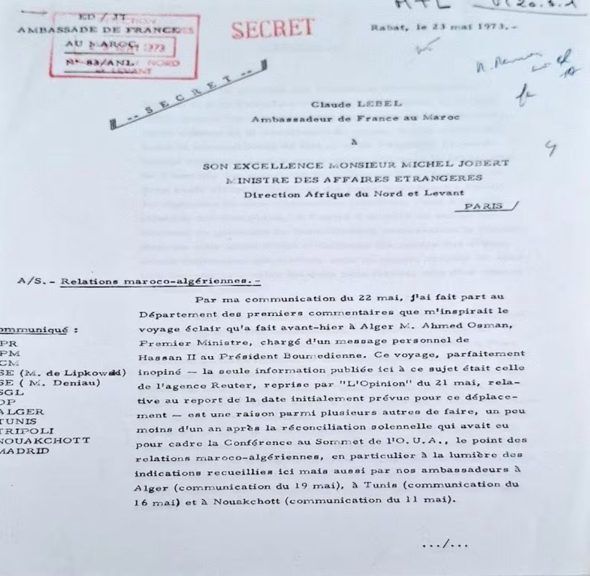 Communiqué secret envoyé par l’ambassadeur de France à Rabat, Claude Lebel et destiné au ministre des Affaires étrangères, Michel Jobert 1.jpeg