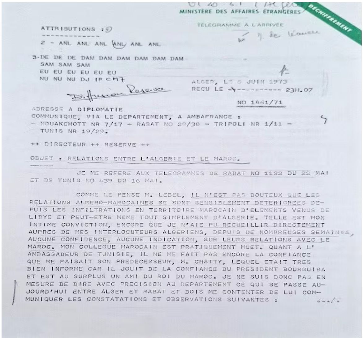 (1) Communiqué secret envoyé par l’ambassadeur de France à Rabat, Claude Lebel et destiné au ministre des Affaires étrangères, Michel Jobert. Archives de La Courneuve, Afrique du Nord, Maroc, Algérie, Mauritanie, 1972-1982, 2046INVA, Carton 897.