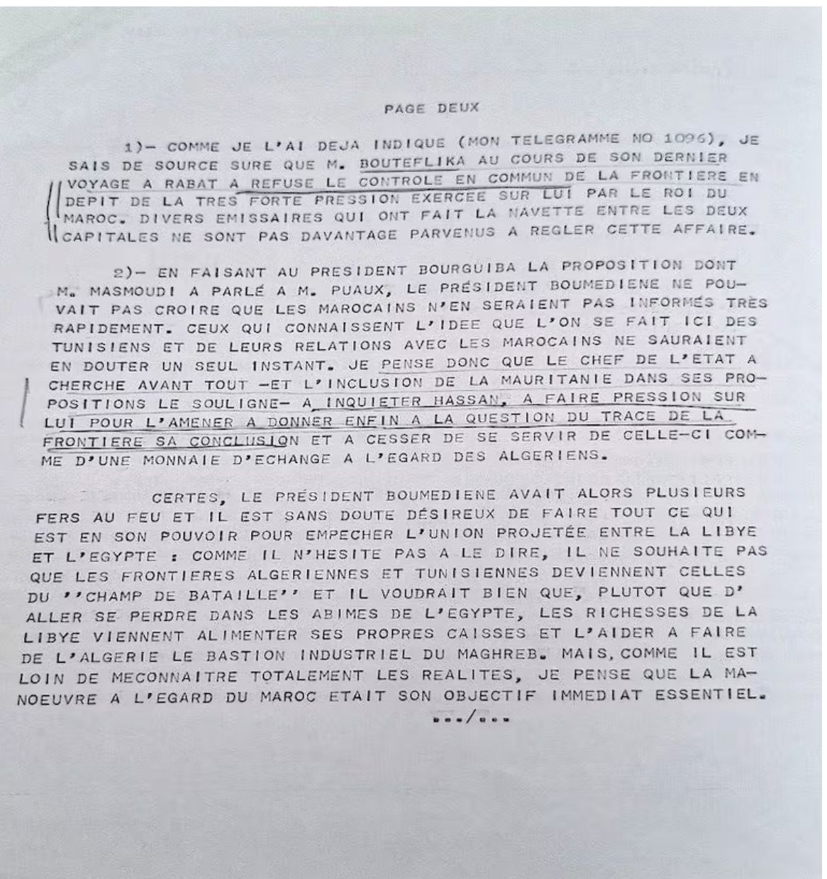 «Mais, comme il (Boumediene) est loin de méconnaitre totalement les réalités, je pense que la manœuvre à l’égard du Maroc était son objectif immédiat essentiel. D’ailleurs, quelques jours après les entretiens du Kef (Entre Boumediene et Bourguiba, en mai 1973), il ratifiait spectaculairement, le 17 mai 1973, les accords de juin 1972 sur le tracé de la frontière algéro-marocaine et sur l’exploitation de la mine du Gara Djebilet (mon télégramme N° 1276). Il mettait ainsi le Maroc au pied du mur au moment même où l’OUA, témoin des engagements pris à Rabat, allait se réunir à Addis-Abeba».