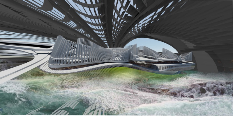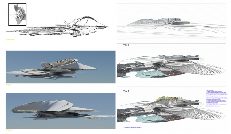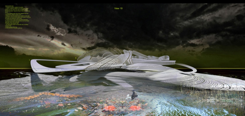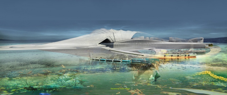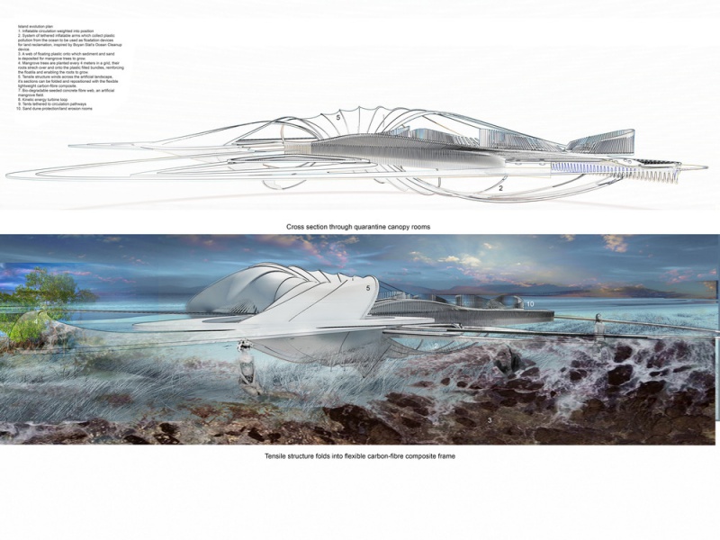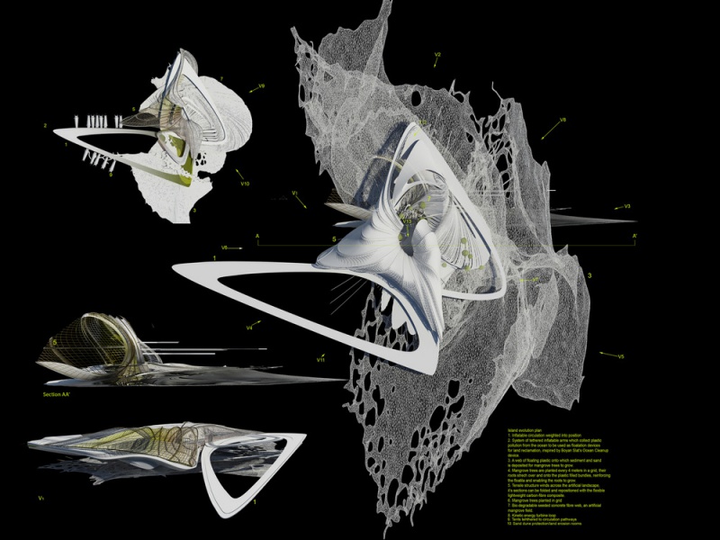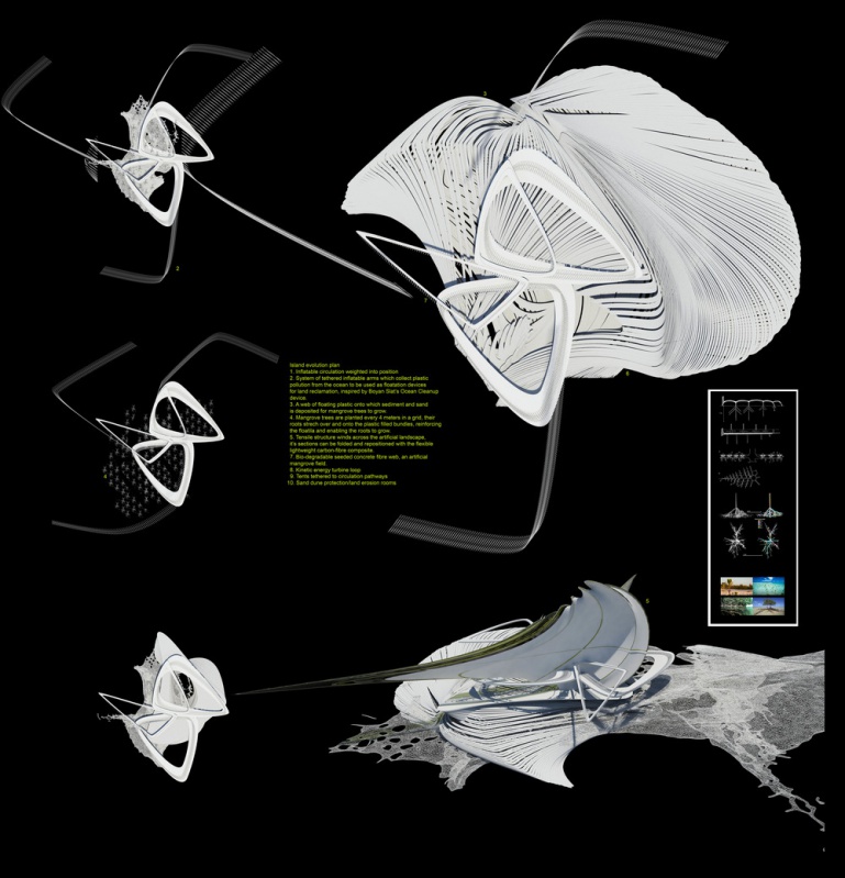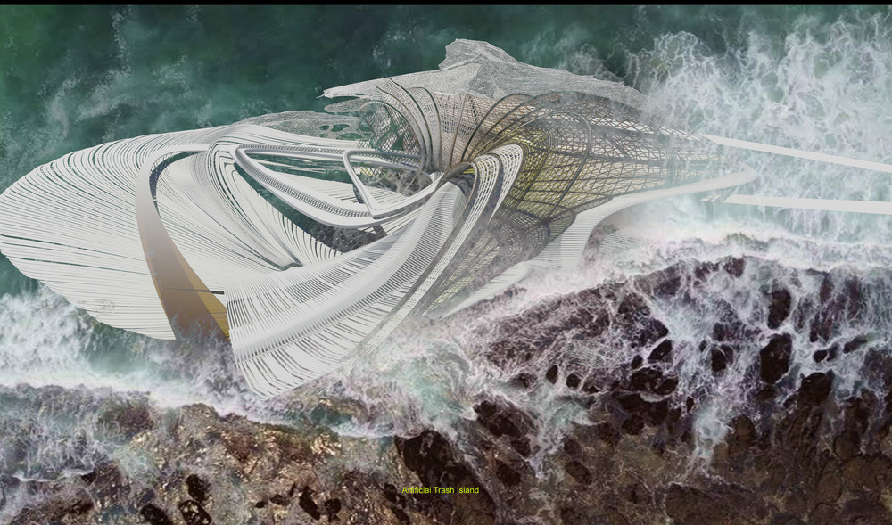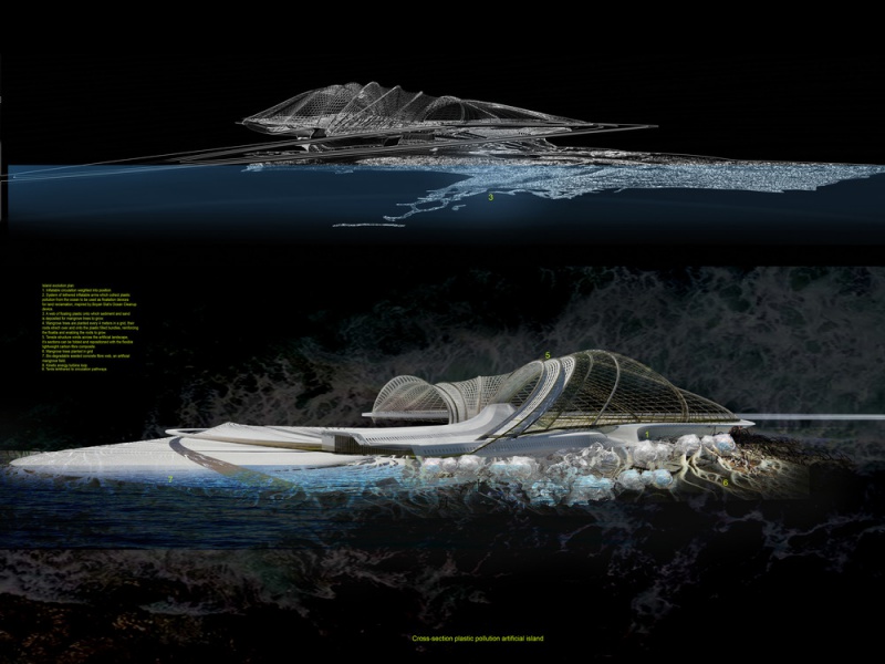 La conception a évolué pour devenir une île artificielle en plastique océanique. Un logiciel de simulation a été utilisé pour comprendre le mouvement et la migration de gros déchets plastiques dans nos océans. Ces déchets plastiques ont traversé les océans par des gyres océaniques. Margot Krasojević Architects a développé une infrastructure qui soutiendrait et s'engagerait dans l'accumulation de déchets plastiques océaniques. Le logiciel de simulation des courants océaniques crée une cartographie de l'accumulation de la plus forte densité de déchets plastiques qui a été utilisée comme point de départ pour comprendre comment collecter ces déchets et les mettre à profit de manière constructive, dans la production d'une île artificielle pour l'habitation. Comme le mémoire demandait un hôtel, c'était un point de départ. Le concept de l'hôtel lui-même est d'évoluer comme un structure auto-réparatrice qui s'est développée à partir des plastiques négligemment jetés capturés à travers ses filtres et des bras gonflés extensibles qui rassemblent et déposent les plastiques afin qu'ils soient placés dans des faisceaux de mailles, qui agissent comme des dispositifs de flottaison. L'idée est inspirée par une équipe néerlandaise qui a cherché à utiliser différents matériaux récupérés pour récupérer la terre.