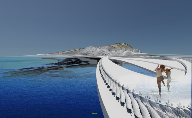 Un élément de conception majeur est une structure plissée de sangles entrelacées, fabriquée à partir d'un treillis de fibres de béton biodégradable. Ces «tentacules» sont libérés du céramicrète au contact de la montée des eaux. Ils se dilatent et se gonflent dans la houle venant en sens inverse en descendant à mesure qu'ils absorbent l'eau créant une barrière artificielle emprisonnant les sédiments et absorbant les eaux de crue. En principe, ce sont les racines artificielles de la mangrove qui constituent le gilet de sauvetage de l'île en cas d'urgence, car elles dilatent les sédiments emprisonnés en créant des terres artificiellement artificielles presque comme une piste gonflable. Chaque tentacule entièrement immergé se dilate et tombe au-dessus du suivant, créant un mur temporaire empêchant l'eau d'inonder l'île tout en le soutenant en cas de dommage. Une fois la tempête stabilisée, les tentacules sont vidés. En utilisant des pompes alimentées par des panneaux solaires, l'eau est redirigée hors de l'île et rejetée dans l'océan Indien. Les tentacules se dilatent lors de l'impact, la pression de l'eau retenant la flottabilité de l'île.