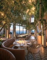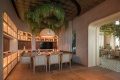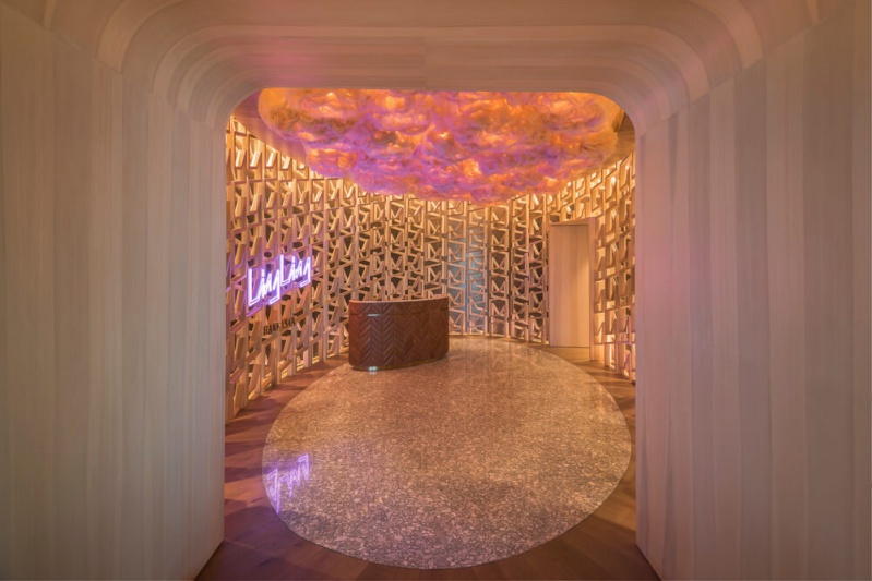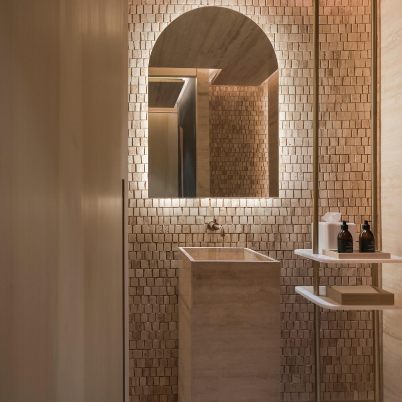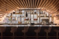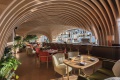 Alternativement, le salon intérieur et la salle à manger sont enfermés dans une structure voûtée construite selon des techniques de stéréotomie du bois, mise en valeur par un éclairage doux et équipée de meubles spécialement conçus.