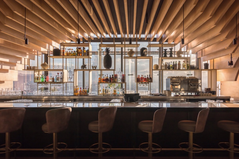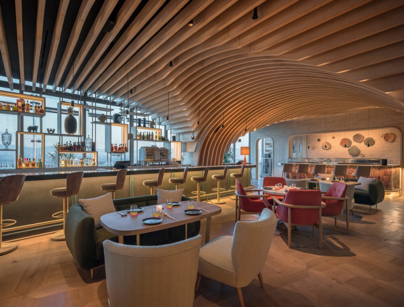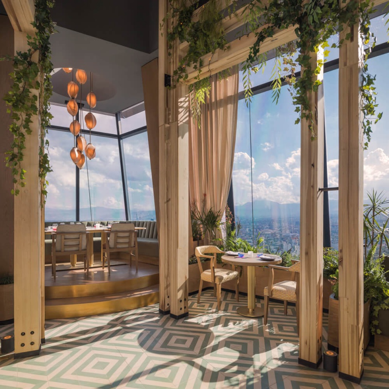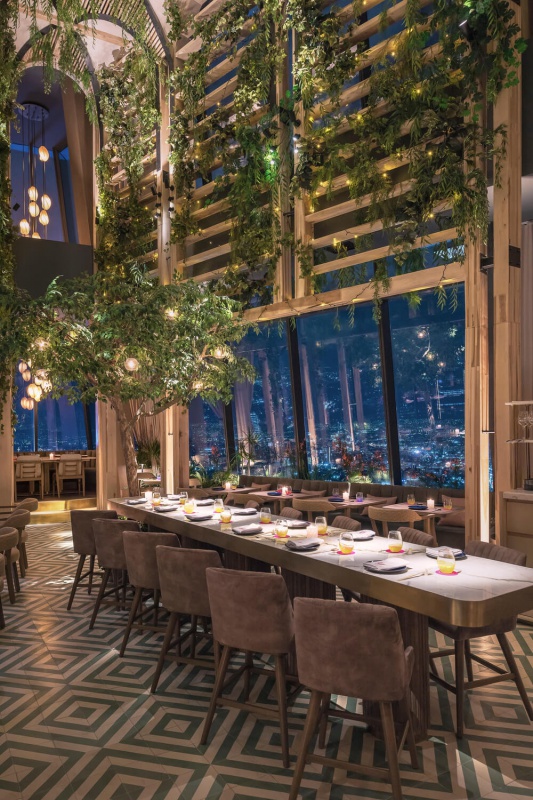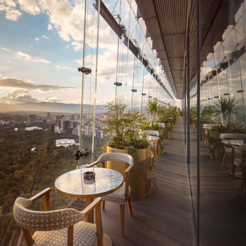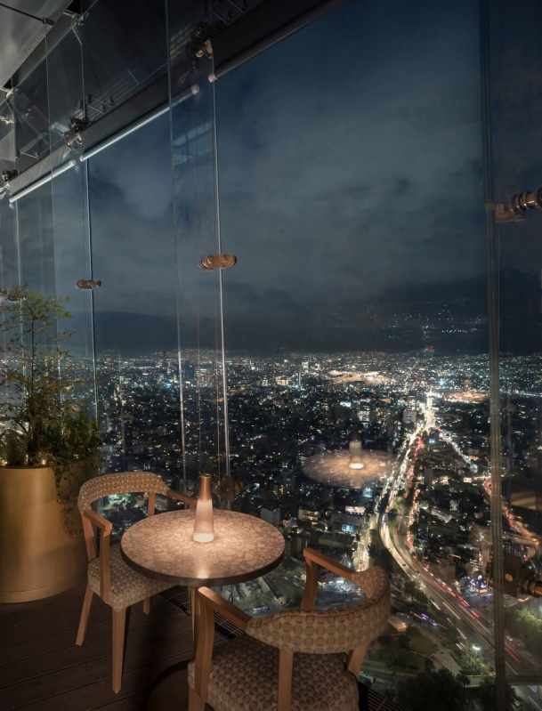 Le concept de design d'intérieur du restaurant est parti de l'idée de créer un espace rappelant les grandes cours et les terrasses caractéristiques de l'architecture mexicaine. L'un des plus grands défis de la conception du projet était de générer la sensation d'être dans une cour au 56e étage.