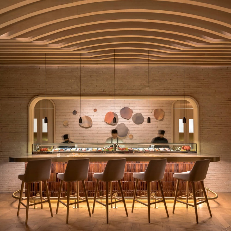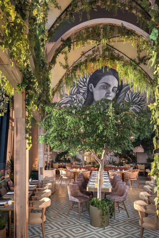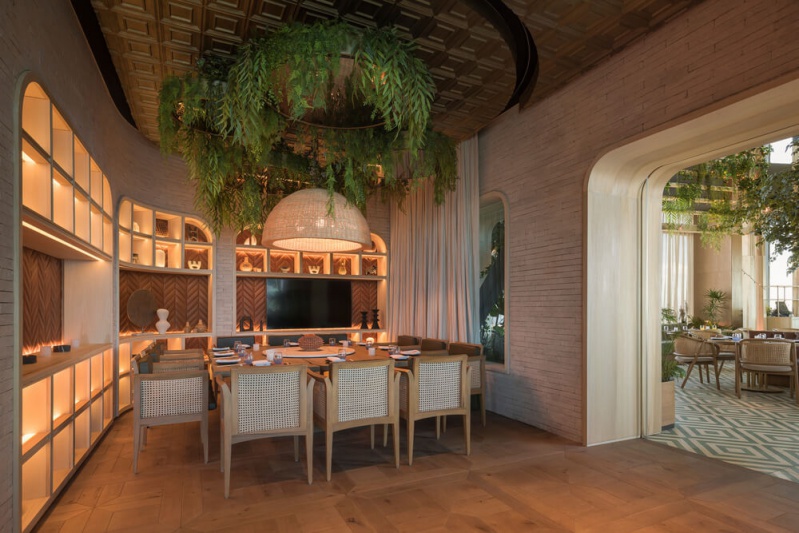 Utilisant une vaste palette de teintes végétales et de lumière comme force motrice de l'ensemble du projet, le restaurant se déploie comme un site plein de caractère et de texture, tant à l'intérieur qu'à l'extérieur.