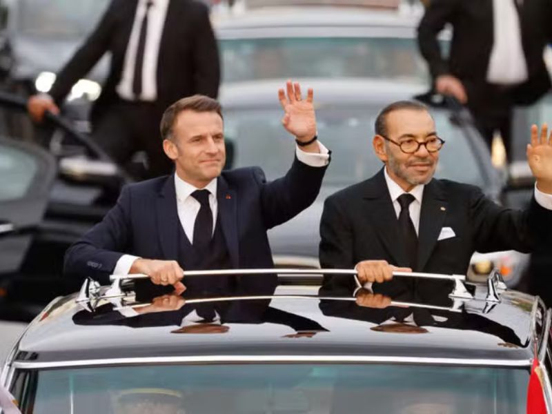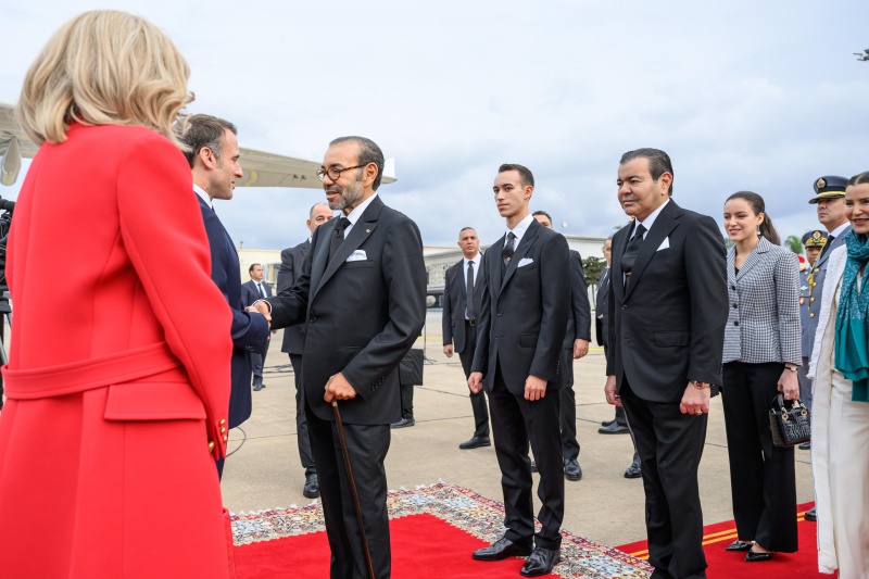 Accompagné de son épouse Brigitte Macron, le président a été chaleureusement accueilli par SM le Roi Mohammed VI, entouré de membres de la famille royale, dont le Prince Héritier Moulay El Hassan et la Princesse Lalla Khadija.