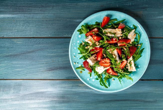 FraisesConcombresMenthe fraîcheCéréales types épeautres ou quinoaPistachesRicotta saléeHuile d’oliveSel, PoivreVinaigre de vin blancMielÉchaloteOrangeRoquette