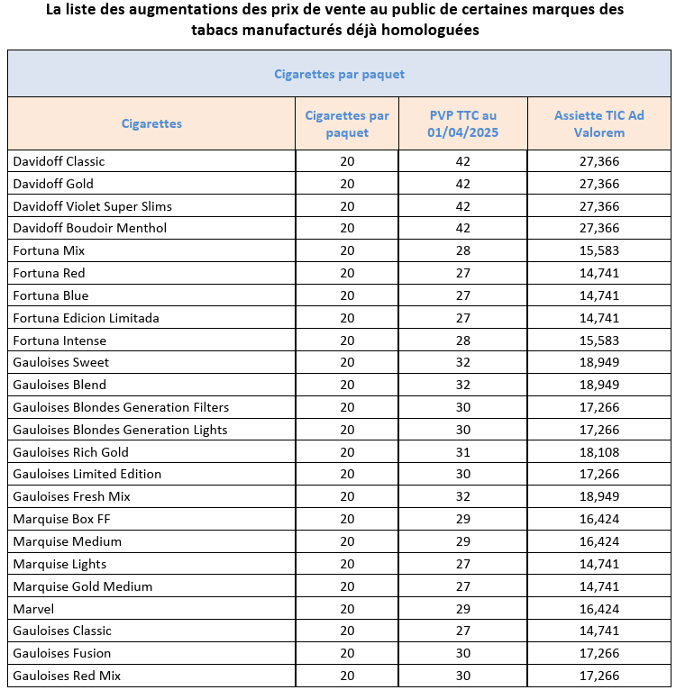 Selon la même source, plusieurs marques de tabac manufacturé sont retirées du marché, notamment Maghreb et Mustang, ainsi que diverses références des marques Fortuna, Marquise et MQS. Par ailleurs, certaines variantes de tabacs à chauffer Heets, telles que Sienna Selection, Sun Pearl et Summer Wave, cessent également d’être commercialisées.